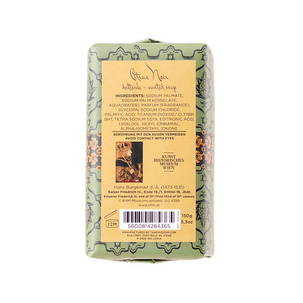 The Soap 150g Kaiser Friedrich is a masterpiece that combines elegance and freshness. With the vibrant fragrance of Citrus Noir, this soap is presented in a paper packaging adorned with a pattern inspired by the iconic painting ?Emperor Friedrich III? by Hans Burgkmair the Elder.