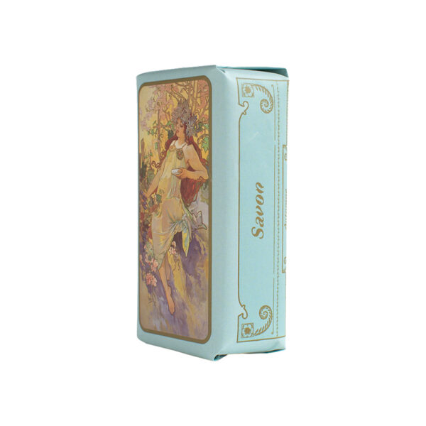 Capturing the serene beauty of the autumn season, the Soap 150g RMN Mucha Automne blends artistic heritage with a warm, earthy fragrance. Featuring Mucha’s graceful “Automne” illustration and wrapped in matte-laminated coated paper, this oval soap brings a sense of calm elegance to your daily routine.